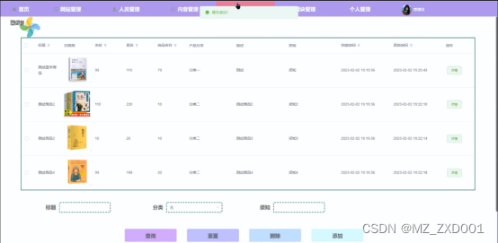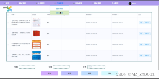 (5)内容管理:当点击“内容管理”这一菜单的时候,会出现图书资讯+资讯分类两个子菜单,可以对这两个模块进行增删改查操作;