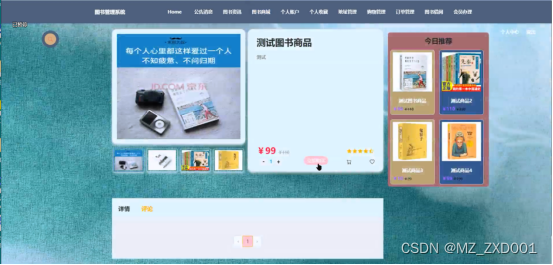 当访客点击了任意图书后将会进入该款图书的详情界面,可以了解到该图书的图片信息、图书信息、价钱信息等,同时可以对该图书进行加购+立即购买+收藏+点赞+评论,图书详情展示页面如图4.5所示。