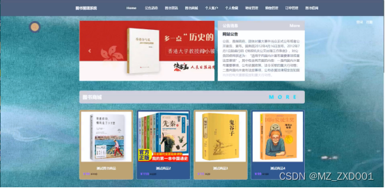 当进入图书管理系统的时候,首先映入眼帘的是系统的导航栏,下面是轮播图以及系统内容,其主界面展示如下图4.1所示。