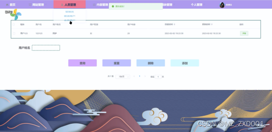(3)人员管理:当点击“人员管理”这一菜单的时候,会出现管理员+普通用户+会员用户三个子菜单,可以对这三个模块进行增删改查操作;