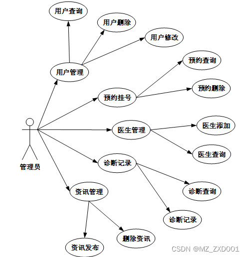 3.管理员主要负责首页、站点管理(轮播图、公告栏)用户管理(管理员、系统用户、医生用户)内容管理(医疗资讯、资讯分类)更多管理(诊断记录、科室分类、医生信息、预约挂号),下图所示描述管理员的用例图。
