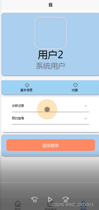 在用户信息页面用户信息可以进行添加、查看、编辑个人信息、收藏、诊断记录、预约挂号等操作如图5.8所示。