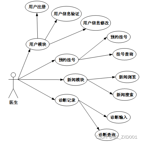 2.医生用户主要使用系统的医院预约挂号业务,下图所示为医生用户的用例图。