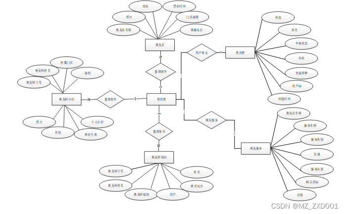 下面是整个城市美发管理系统中主要的数据库表总E-R实体关系图。