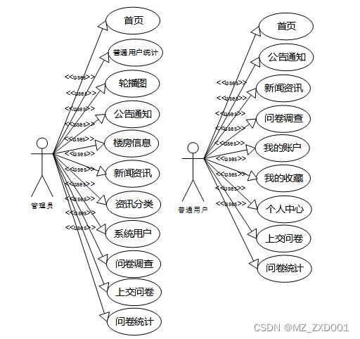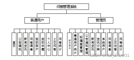 普通用户登录问卷管理系统,功能为:首页,公告通知,新闻资讯,问卷调查,我的(我的账户,我的收藏,个人中心),后台首页,模块管理(问卷调查,上交问卷,问卷统计)等功能,如下图所示: