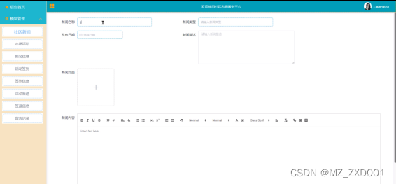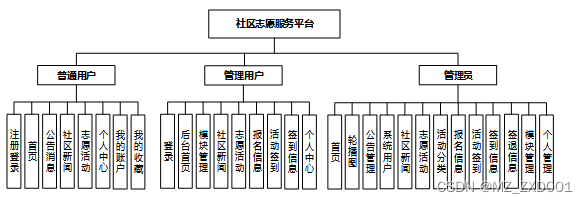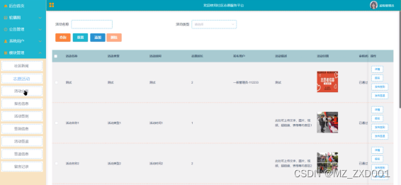 (1)功能要求:完成后台首页、个人资料(个人信息、修改密码)、播图管理、公告管理、系统用户(普通用户、管理用户、管理员)模块管理(社区新闻、志愿活动、活动分类、报名信息、活动签到、签到信息、活动签退、签退信息、留言记录)等功能模块。