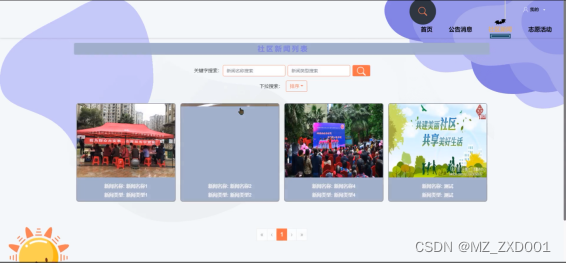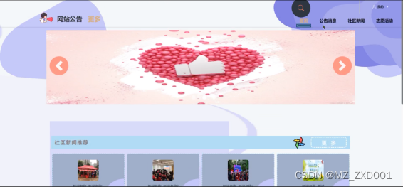 用户登录系统可以查看功能:首页、公告消息、社区新闻、志愿活动、我的账户、我的收藏、个人中心等。如图5-7所示。