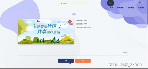 用户在点击导航栏上面的社区新闻后,就可以搜索查看社区新闻信息,用户根据自己的喜好可以进行点赞、收藏、发表评论等,社区新闻界面如下图5-115-12所示。