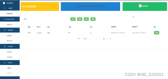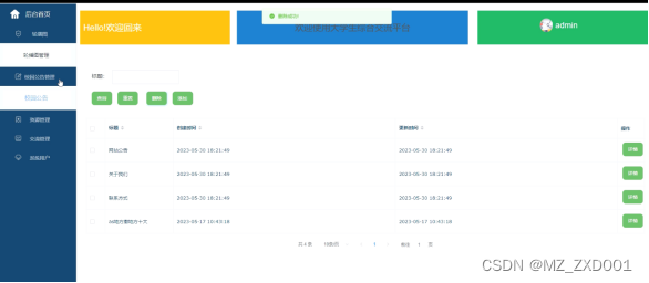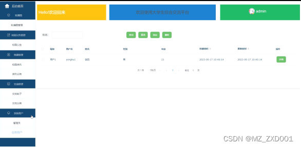 用户通过登录进入到系统操作界面后,可以根据需求对首页、轮播图、校园公告、资源管理(校园资讯、资讯分类)交流管理(交流帖子、交流分类)系统用户(管理员、会员用户)等模块进行管理维护操作。
