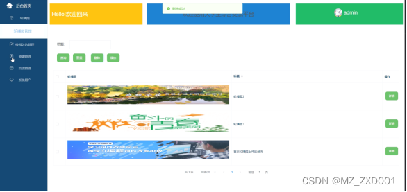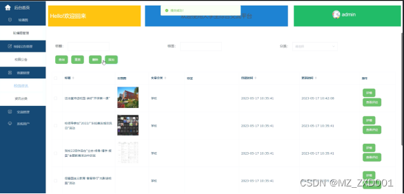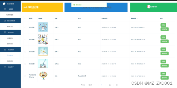 管理员进入到界面,通过界面的任务大厅,登录成功后进入到系统可以进行查看首页、轮播图、校园公告、资源管理(校园资讯、资讯分类)交流管理(交流帖子、交流分类)系统用户(管理员、会员用户)等功能模块,进行相对应操作,如图5-8所示。