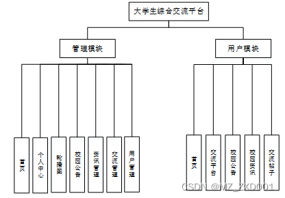 这些功能可以充分满足大学生综合交流平台的需求。此系统功能较为全面如下图系统功能结构如图4-5所示。