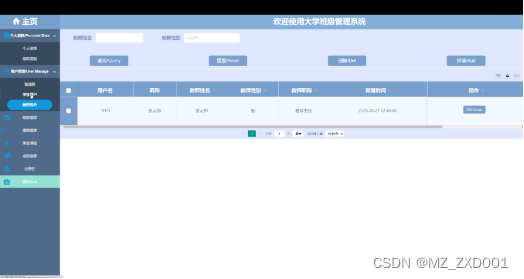 用户管理-教师用户,在此界面图可添加教师用户信息内容:用户名,昵称,教师姓名,性别,职称等信息,还可在此页面对进行重置,删除,新增等操作,如图5-4。