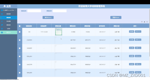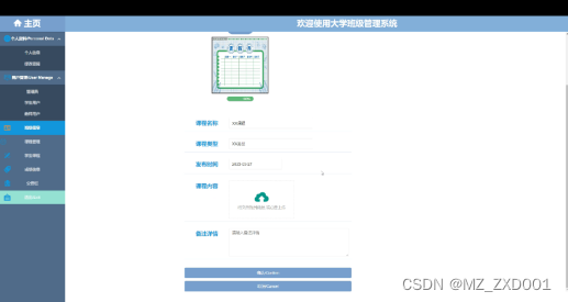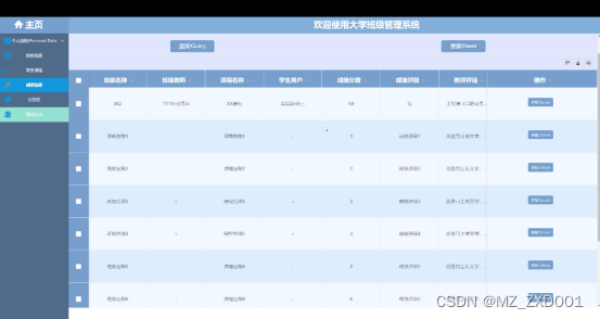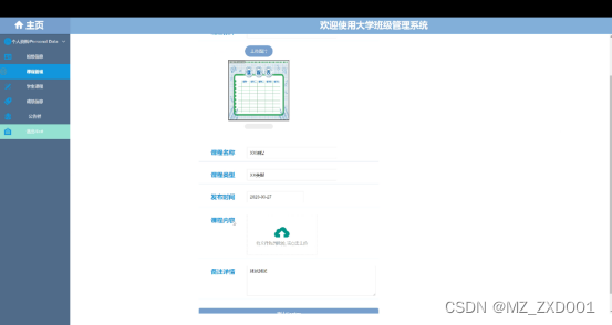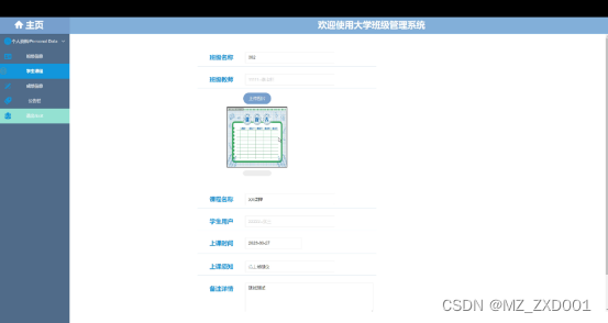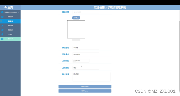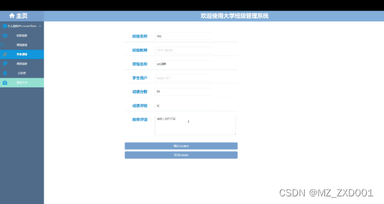 教师登录大学班级管理系统,后台功能为:主页,个人资料(个人信息,修改密码),班级信息,课程信息,学生课程,成绩信息,公告栏等功能,如下图所示: