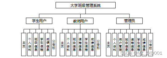 大学班级管理系统在对需求做解析后,整个系统主要分为管理员和教师用户,学生用户,每个模块下的分支功能不一样。管理员模块包括:主页,个人资料(个人信息,修改密码),用户管理(管理员,学生用户,教师用户),班级信息,课程信息,学生课程,成绩信息,公告栏;教师用户模块包括:主页,个人资料(个人信息,修改密码),班级信息,课程信息,学生课程,成绩信息,公告栏等模块。学生用户模块包括:主页,个人资料(个人信息,修改密码),班级信息,学生课程,成绩信息,公告栏等模块。