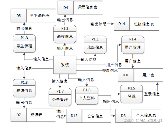 二层数据流程是对一层数据流层图中填写登录信息、用户功能的细化。即:填写登录信息细化为填制信息、后台审核,用户功能细化为用户管理,班级信息,课程信息,学生课程,成绩信息等操作。