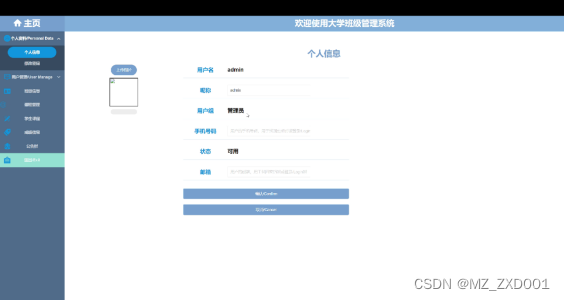 管理员登录大学班级管理系统,管理员后台功能为:主页,个人资料(个人信息,修改密码),用户管理(管理员,学生用户,教师用户),班级信息,课程信息,学生课程,成绩信息,公告栏等功能,如下图所示: