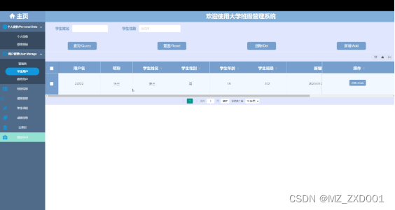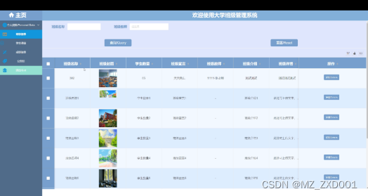 学生登录大学班级管理系统,功能为:主页,个人资料(个人信息,修改密码),班级信息,学生课程,成绩信息,公告栏等功能,如下图所示: