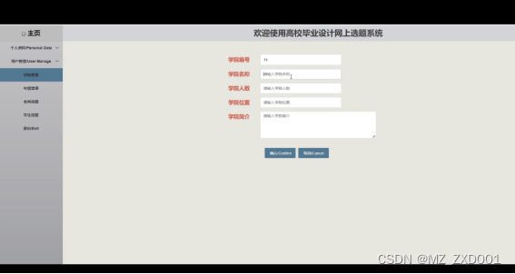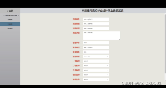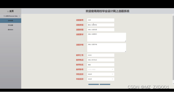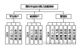 (1)功能要求:可以管理主页,个人资料,用户管理(管理员,学生用户,教师用户),学院管理,年级管理,老师选题,学生选题等功能模块。