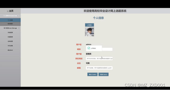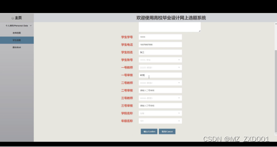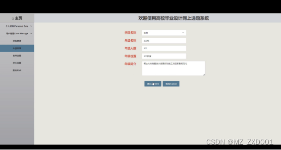 3、功能的完善性:可以管理首主页,个人资料,用户管理(管理员,学生用户,教师用户),学院管理,年级管理,老师选题,学生选题等模块的修改维护操作。