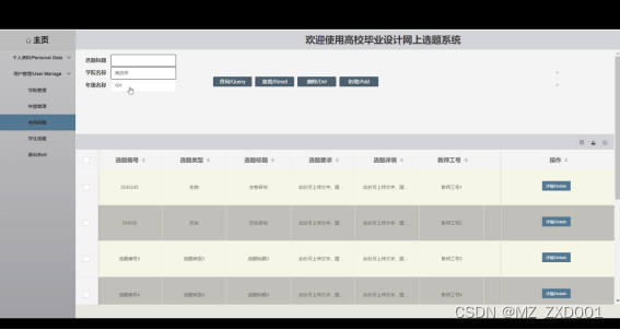 老师选题,在此页面可以维护管理老师选题的信息,包括选题编号,类型,标题,选题要求,详情,教师信息等,并可根据需要进行查询,重置,删除,添加等操作,如下图所示。
