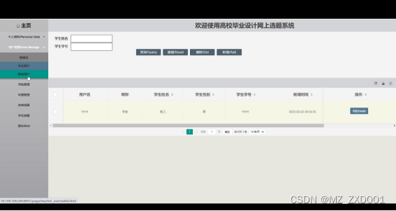 学生选题,在此页面学生可以通过输入选题编号,类型,标题,选题要求,详情,学生信息等内容提交选题申请,等待老师审核答复。并可根据需要进行查询,重置,删除,添加等操作,如下图所示。