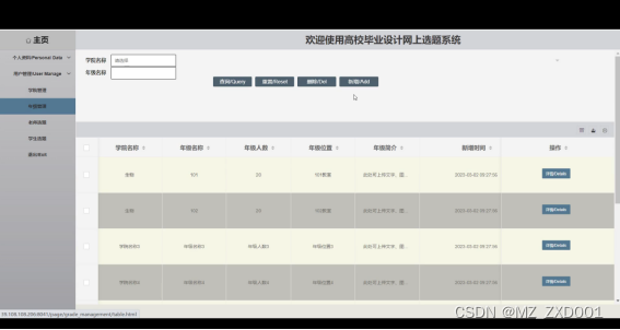年级管理,在此页面可以维护管理年级的信息,包括学院名称,年纪名称,人数,简介等信息,并可根据需要进行查询,重置,删除,添加等操作,如下图所示。