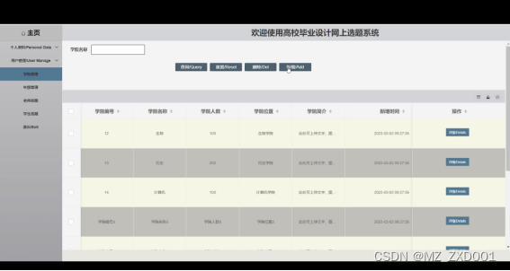 学院管理,在此页面可以维护管理学院的信息,包括学院编号,名称,人数,位置,简介等信息,并可根据需要进行查询,重置,删除,添加等操作,如下图所示。