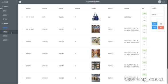 (3)货物信息:点击“货物信息”这一按钮可以查看到系统当中所有的货物信息,支持通过货物名称或者货物编号进行查询货物信息,如果想要添加新的货物,点击“添加”按钮,然后根据提示填写好货物的具体信息,点击提交所添加的货物信息在数据库就保存下来了,同时可以点击“入库、出库”按钮,输入入库的货物信息进行提交,也可以选择要删除的货物直接点击“删除按钮”进行货物删除。