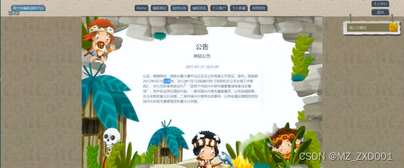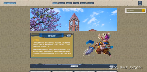 (1)首页信息:当用户进入本青少年编程训练平台的前台的时候,首先展示在眼前的是导航栏、编程测试、站内公告、编程资讯、个人账户、个人收藏、成绩排名等信息,用户可以根据自己个人的需求进行查看;