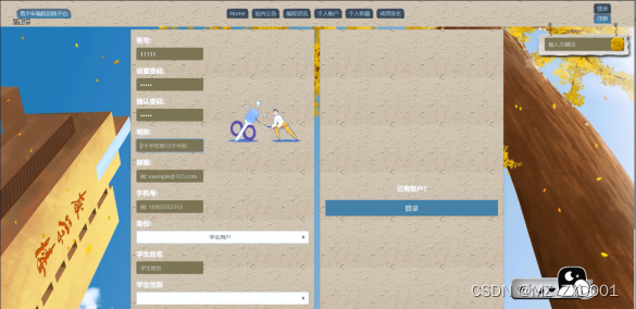不是青少年编程训练平台中用户的是可以在线进行注册的,当用户点击右上角“注册”按钮的时候,当填写上自己的账号+密码+确认密码+昵称+邮箱+手机号等信息后再点击“注册”按钮后将会先验证输入的有没有空数据,再次验证密码和确认密码是否是一样的,最后验证输入的账户名和数据库表中已经注册的账户名是否重复,只有都验证没问题后即可注册成功。其用户注册界面展示如下图4.2所示。