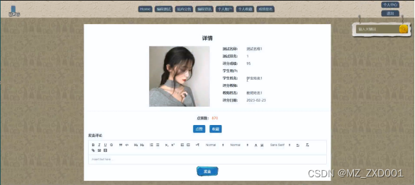 用户可以查看成绩排名信息,在查询到自己想要了解的成绩排名的时候,可以进入查看详细的介绍,支持用户对喜欢的成绩排名进行收藏、点赞的功能。成绩排名详情界面如下图4.6所示。