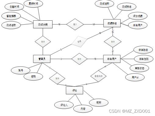 青少年编程训练平台的E-R图主要是根据学生用户以及管理员的实际需求设计的,用户注册以后可以查看成绩排名,只有注册登录以后才可以进行成绩排名查询;管理员对整个系统的评论、公告等进行综合管理。青少年编程训练平台采用的是MYSQL的数据库进行存储的,数据库里面储存了很多的表信息,在此罗列出来一些主要的数据库E-R模型图。