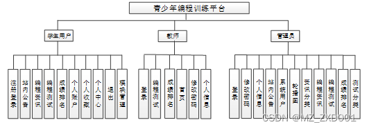 青少年编程训练平台整体的功能模块包括管理员+学生用户+教师用户三个模块,实现了对青少年编程训练平台相关信息的查询管理,系统功能模块如图所示。