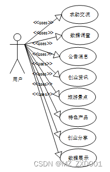 系统设计的目的是分析系统包括的所有功能结构,为开发人员设计开发和实现系统做好准备工作。经过前期的需求调查、分析和整理之后,确定的总体需求主要包括多个模块,分别是:求助交流、数据调查、公告消息、创业资讯、旅游景点、特色产品、创业分享、数据展示。系统整体角色分为二个部分,一是用户、最后是管理员。权限分布也是很明显,用户是在除去浏览信息之外还具有查询和管理自己首页、求助交流、数据调查、公告消息、创业资讯、旅游景点、特色产品、创业分享、数据展示等权限;管理员是最高权限拥有者。