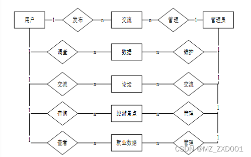 对于一个要开发的系统来说,E-R图可以让别人能更快更轻松的了解此系统的事务及它们之间的关系。根据系统分析阶段所得出的结论确定了在基于大数据技术的创业推荐系统 中存在着多个实体分别是用户、管理员、交流、就业数据。