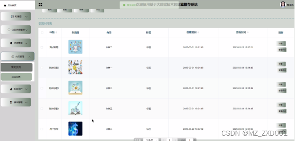 本设计主要实现集人性化、高效率、便捷等优点于一身的基于大数据技术的创业推荐系统 ,完成轮播图、公告消息、资源管理(创业资讯、资讯分类、数据调查)系统用户(管理员、普通用户)模块管理(首页、求助交流、公告消息、创业资讯、旅游景点、特色产品、创业分享、创业数据、数据展示)等功能模块。系统通过浏览器与服务器进行通信,实现数据的交互与变更。本系统通过科学的管理方式、便捷的服务提高了工作效率,减少了数据存储上的错误和遗漏。基于大数据技术的创业推荐系统 使用Java语言,采用基于 MVC模式的SSM技术进行开发,使用 MyEclipse 2017 CI 10 编译器编写,数据方面主要采用的是微软的MySQL关系型数据库来作为数据存储媒介,配合前台HTML+CSS 技术完成系统的开发。