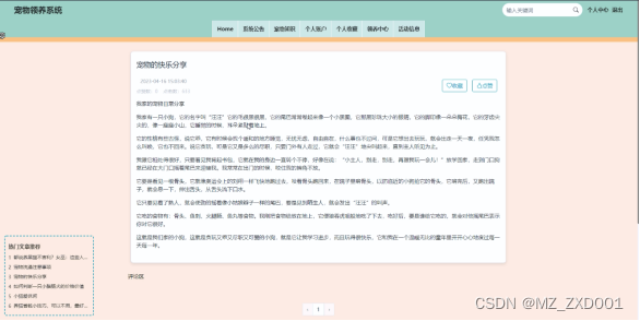 当访客点击宠物领养系统中导航栏上的“宠物知识”后将会进入到该“宠物知识”列表的界面,然后选择想要看的宠物知识,点击进入到详细界面,同时可以进行点赞、收藏、评论操作,宠物知识界面如下图4-4所示。
