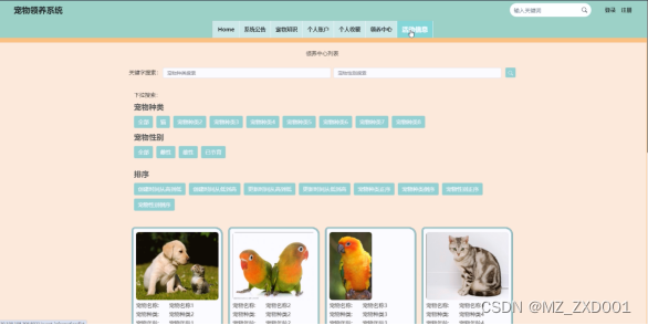 (4)领养中心:当用户点击“领养中心”这一菜单按钮,会显示管理员在后台发布的所有的领养中心,支持通过关键词对领养中心进行搜索,选择需要的领养中心点击可以进入到领养中心详细的介绍界面,在详细界面可以查看到领养的宠物编号、宠物种类、宠物性别、送养用户、宠物名称、宠物年龄、领养协议、送养住址等信息,同时可以进行领养申请、打卡、收藏、点赞、评论操作;