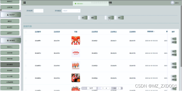 管理员点击“活动信息”会显示出所有的活动信息,支持输入活动编号或者活动名称对活动信息进行查询,如果想要添加新的活动信息,点击“添加”按钮,输入活动编号、活动名称、封面、活动类型、活动地点、活动时间等信息,点击“提交”按钮就可以添加了,同时可以选择某一条活动信息,点击“删除”进行删除,也可以对用户提交的活动信息评论的信息进行管控。界面如下图4-13所示。