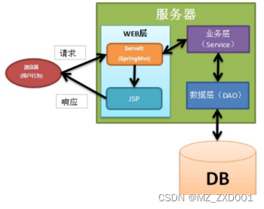 页面发送请求给控制器,控制器调用业务层处理逻辑,逻辑层向持久层发送请求,持久层与数据库交互,后将结果返回给业务层,业务层将处理逻辑发送给控制器,控制器再调用视图展现数据。