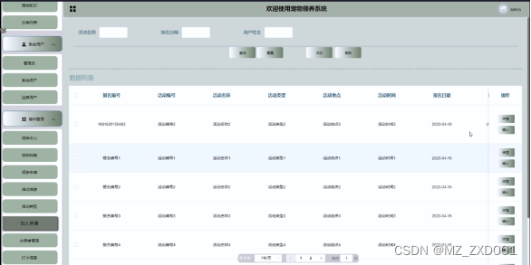 (5)模块管理:在“模块管理”这一菜单下,我们会看到领养中心、宠物种类、领养申请、活动信息、活动类型、加入申请、志愿者管理、打卡信息,管理员可以对其进行增删改查操作。