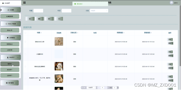 (3)资源管理:管理员点击“资源管理”菜单能够对其下子菜单宠物知识和分类列表进行增删改查。