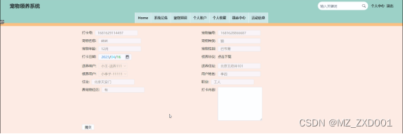 (6)打卡:当用户在领养中心详情界面想要进行打卡,点击下方的“打卡”按钮,就会跳转到打卡信息填写界面,根据界面提示输入打卡信息,点击“提交”按钮,打卡就完成了;