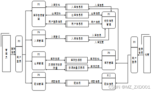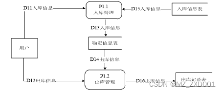 2.数据流图1层管理员可以对库存进行管理,产生库存信息表,把库存信息传递给物资信息管理,产生物资信息表,在把物资信息传给统计管理,对信息进行统计,也会把统计的信息传给管理员,用户还可以通过物资信息管理查看物资库存信息。