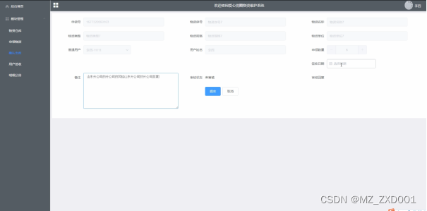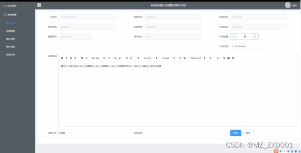 2.主要功能管理模块包括首页、模块管理(物资仓库、申领物资、确认出库、用户签收、明细公告)。