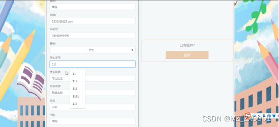 学生用户注册,用户通过输入账号,密码,昵称,邮箱,手机号,学号等信息进行账号注册,并在通过管理员审核后可登录,如图5-7所示。