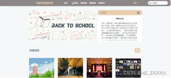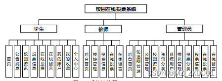 (1)功能要求:首页,轮播图管理,公告管理,资源管理(校园资讯,资讯分类),系统用户(管理员,学生,教师),模块管理(投票分类,投票信息,在线投票,在线留言)等功能模块。