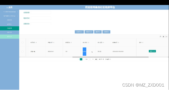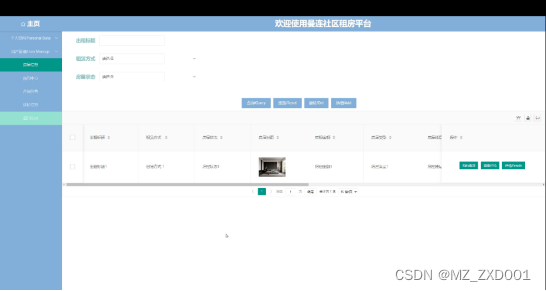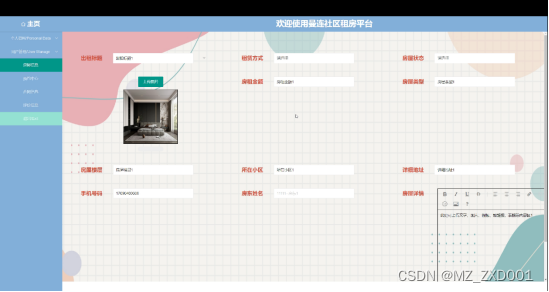 房屋信息管理,在此页面可以通过输入:封面,房租金额,房屋类型,楼层,所在小区等信息添加房屋信息,还可以进行添加、删除或详细等操作,如下图所示。