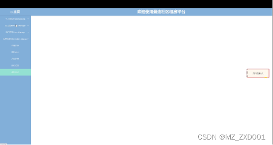 房东用户登录系统后台可查看功能有主页,个人资料(个人信息,修改密码),用户管理(普通用户),信息管理(房屋信息,预约中心,合同信息,评价信息)等功能,如下图所示。