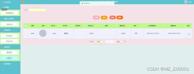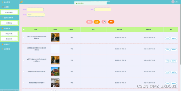 (2)校园公告:管理员点击“校园公告”菜单可以查看到系统中的所有校园公告信息,对已经存在的校园公告,管理员可以修改,也可以添加新的校园公告或者删除校园公告。